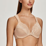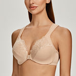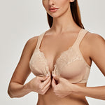57%Polyester, 33%Polyamide, 10%Spandex<br/>Convenient front clasp closure is easy on / offWide, cushioned, adjustable straps provide extreme comfort and help relieve back and shoulder stressSide support panels provide extra support and help center your breastsUnderwire bra with featuring lace insets on cups for a curve-conforming fitSoft, stretchy sides wick moisture and keeps you cool and smooth away bulges.