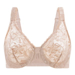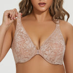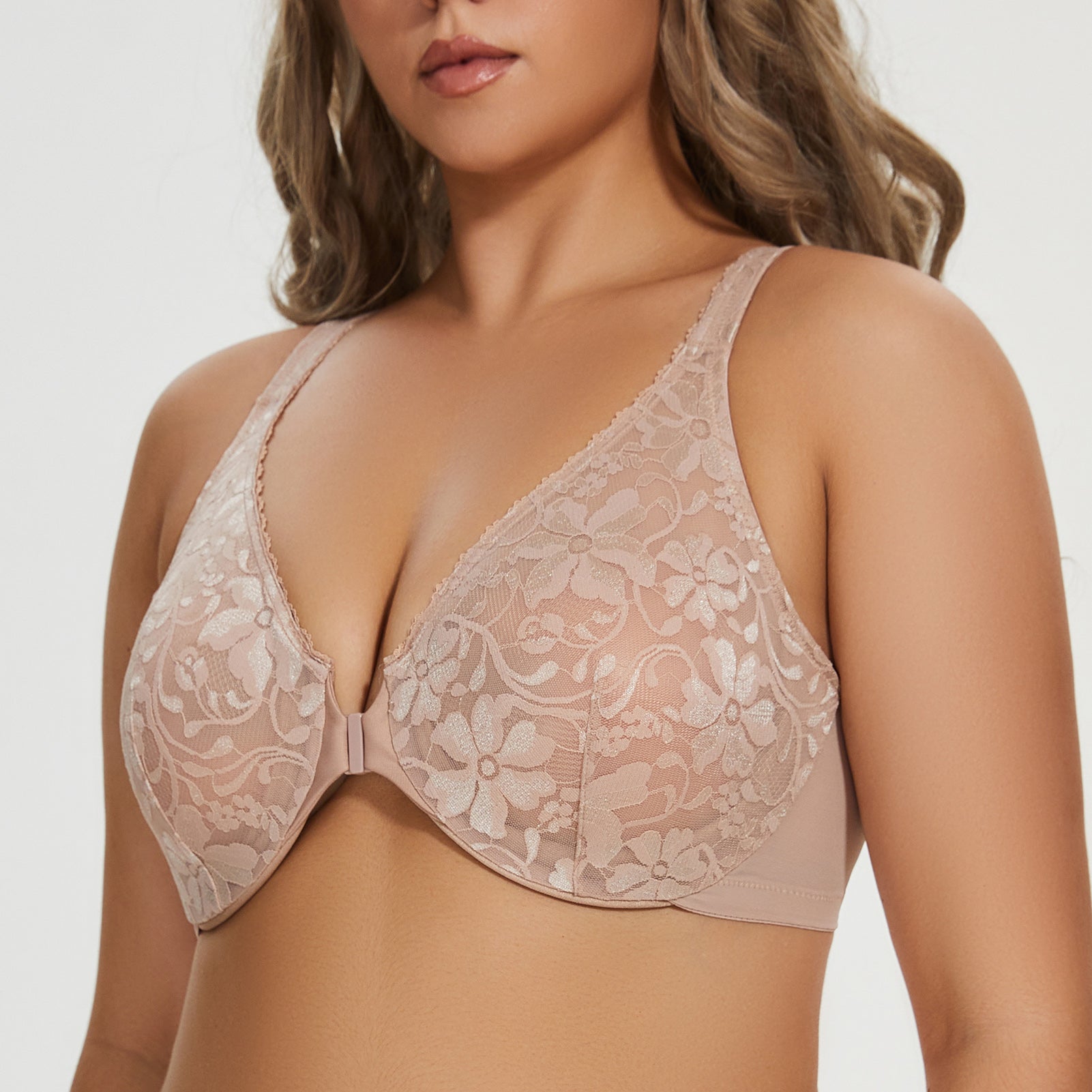 A pretty, stretch lace, front-close leisure bra that's perfect for plus sizes. The special underwire - flexible underwire - and a fiberfill cushioned band guarantees comfort.