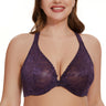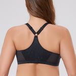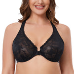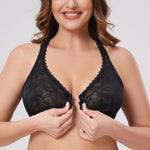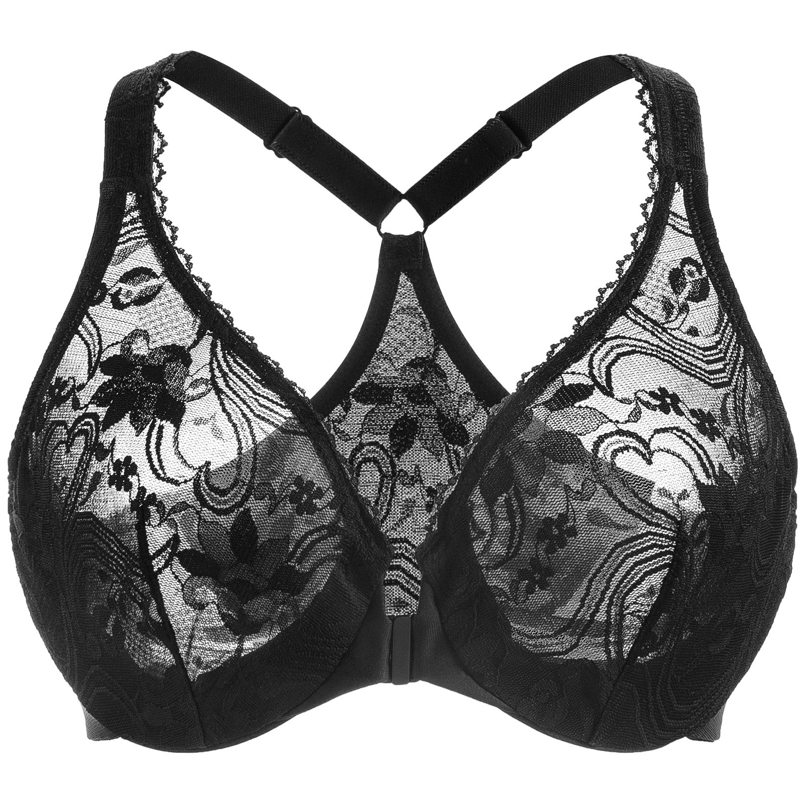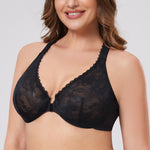 90%Polyamide,10%Spandex<br/>Front close bras is easy on and off for full busts.Underwire cups are unpadded with lovely sheer lace for a sexy look.Adjustable straps meet at back with a racerback that allows you to move with ease.Tall, stretch powermesh sides have elastic edges and lightly smooth the back.Added cushioning satin at bottom of cup for consistent hold. Please Note:Model is wearing nipple covers for modesty.
