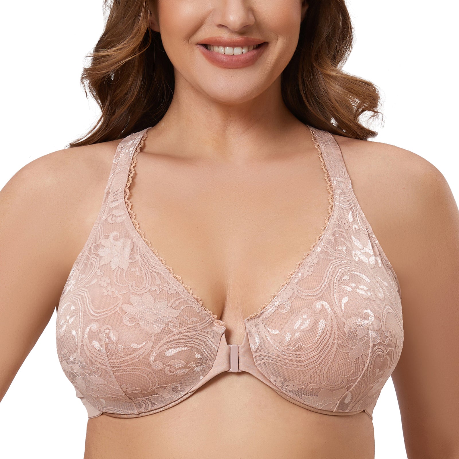 MELENECA Women's Plus Size Racerback Unlined Lace Underwire Front Closure Bra Beige