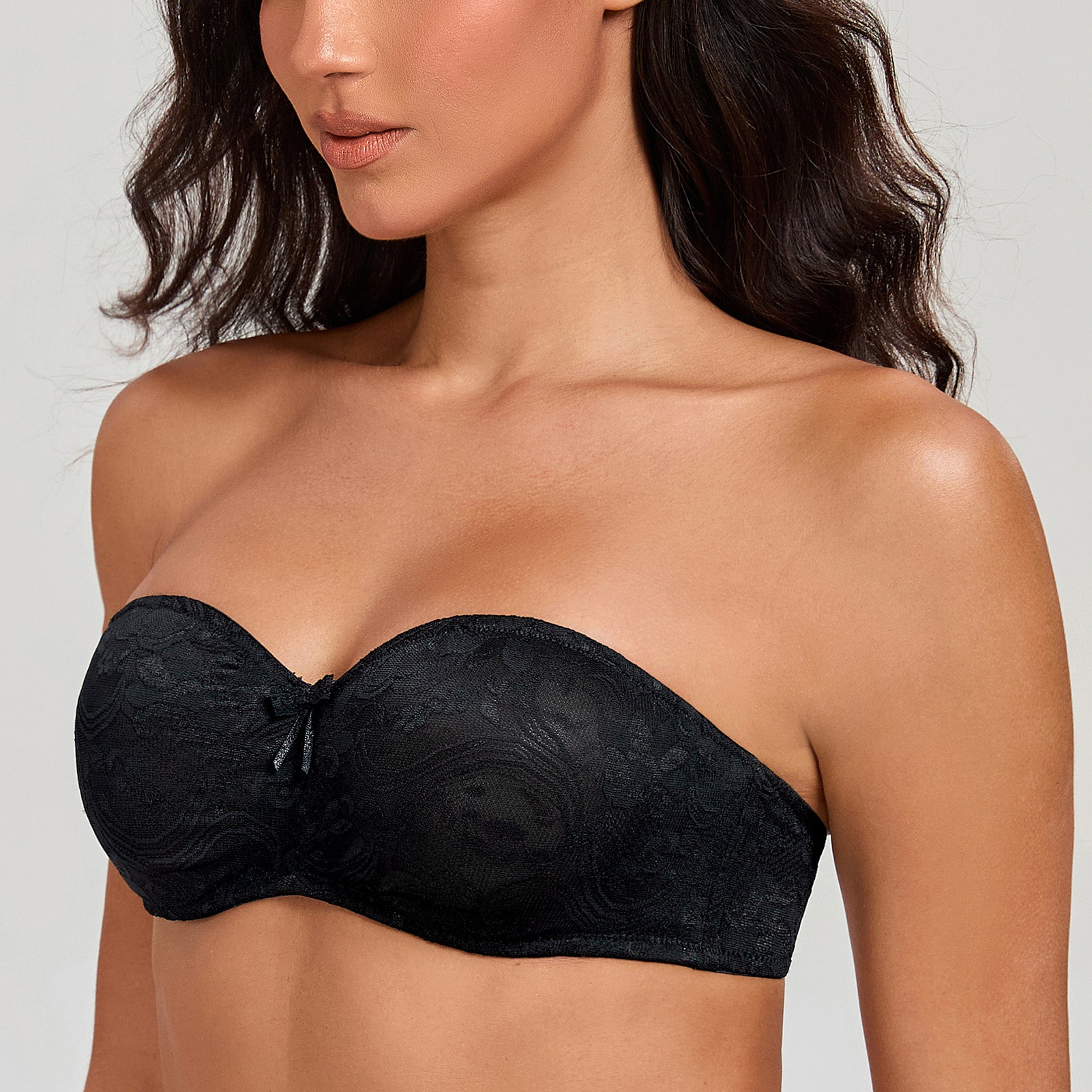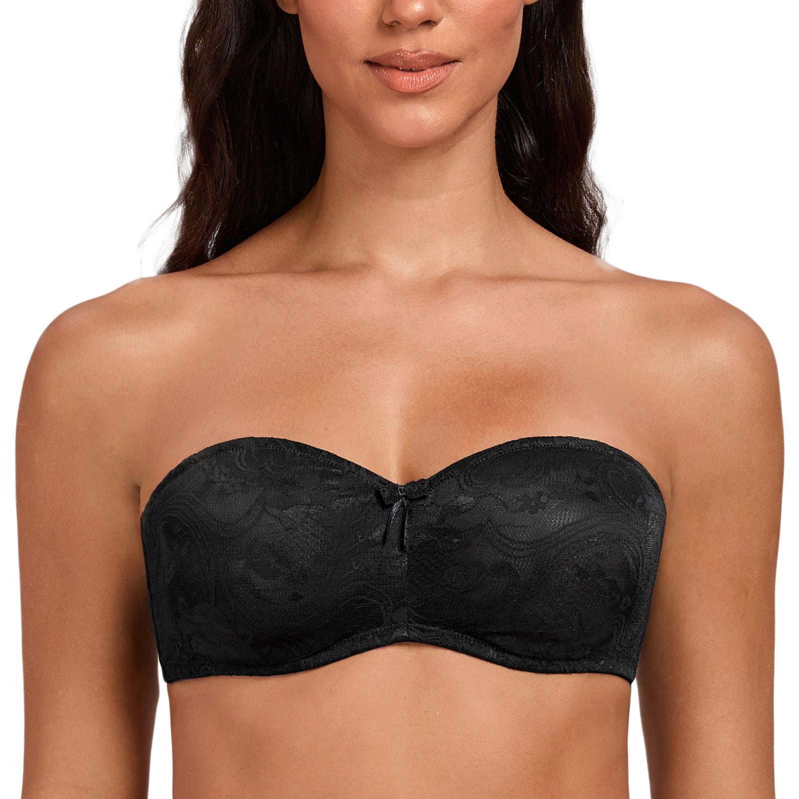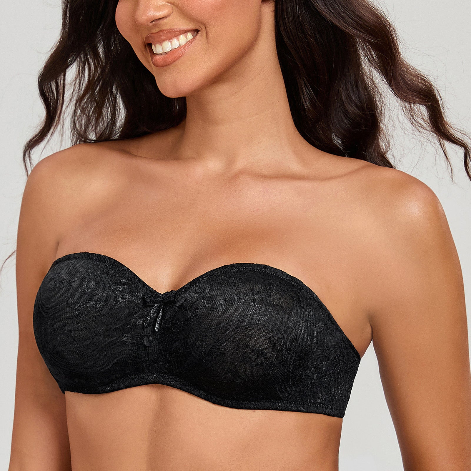 90% Polyamide, 10% Elastane<br/>Soft, sheer, molded stretch lace cups offer natural shape and comfortUnderwire cups have mesh lining to shape and support the bustInner silicone gripper along the top and bottom of bra for stay-put fitSide seam features flexible boning for a extra support.Comes with adjustable and removable straps, convertible from classic to halter, crossed back, one-shoulder or strapless bandeau